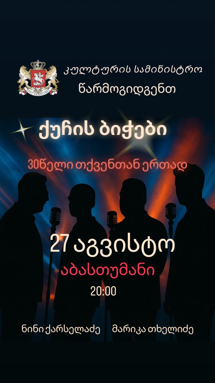 27 აგვისტოს, 20:00 საათზე, დაბა აბასთუმანში გაიმართება ჯგუფი ,,ქუჩის ბიჭების” საიუბილეო კონცერტი. 30 წელი თქვენთან ერთად!